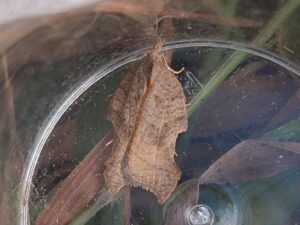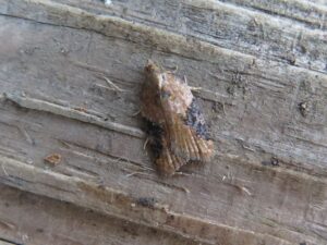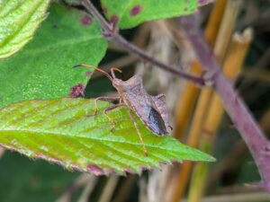 Overhead – Raven, Buzzard and Swift; Blackbird, Robin, Blue tit, Great tit, Woodpigeon, Pheasant (heard), Goldfinch. Dock Bug, Hawthorn Shieldbug, Red-legged Shieldbug. Speckled Wood 1, Green-veined White 1, Gatekeeper 3. Latticed Heath, a looper caterpillar swept from Bullace tree, and Acleris emargana (Scalloped Tortrix moth) swept from Poplar sp. tree.